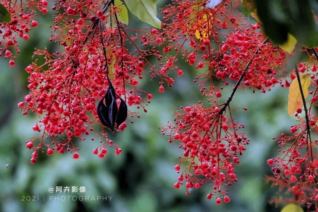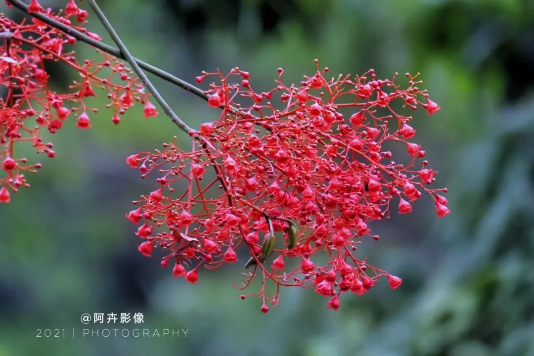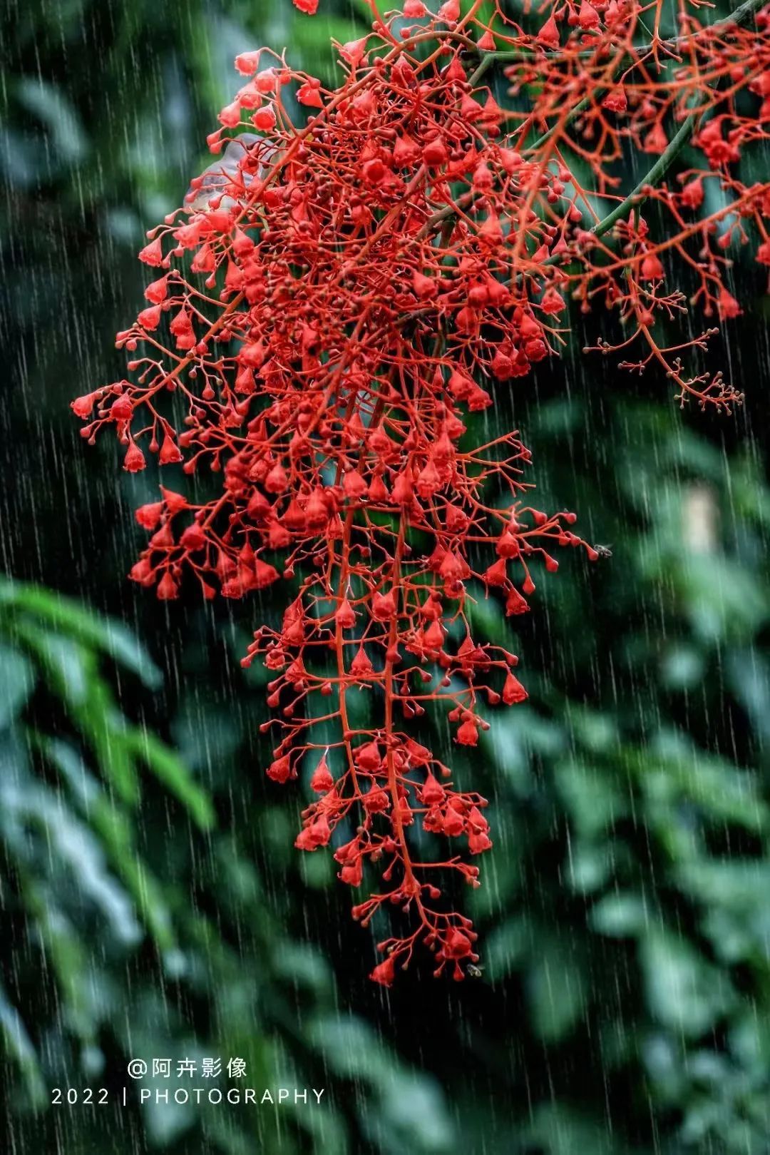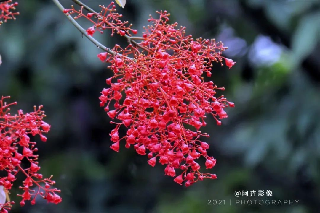 一场大雨洗礼后,晶莹剔透的水珠为花序晕染开了醉红的妆容,再往深处看,密匝匝的花簇戏耍着亮晶晶的水珠于枝丫间穿梭,更显娇艳欲滴。