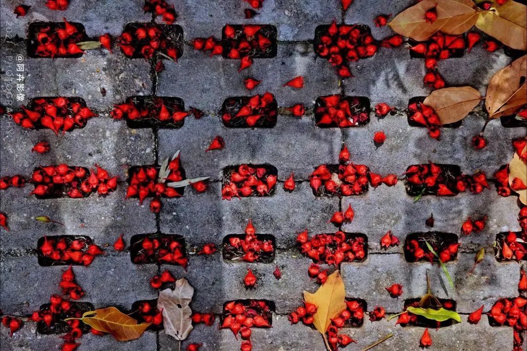 漫步在公园林荫小道上,远远望去,澳洲火焰木挺拔矗立,形如华盖的树冠上缀满丹霞,染红了整片树林。掉落的红艳花瓣与投下的斑驳树影相互映衬,好似一副浓淡相宜的剪贴画。