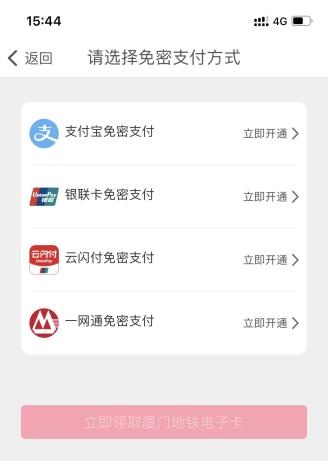 在“厦门地铁AMTR”APP首页点击“地铁•BRT”乘车按钮,绑定一种免密支付方式后,领取“厦门地铁电子卡”。