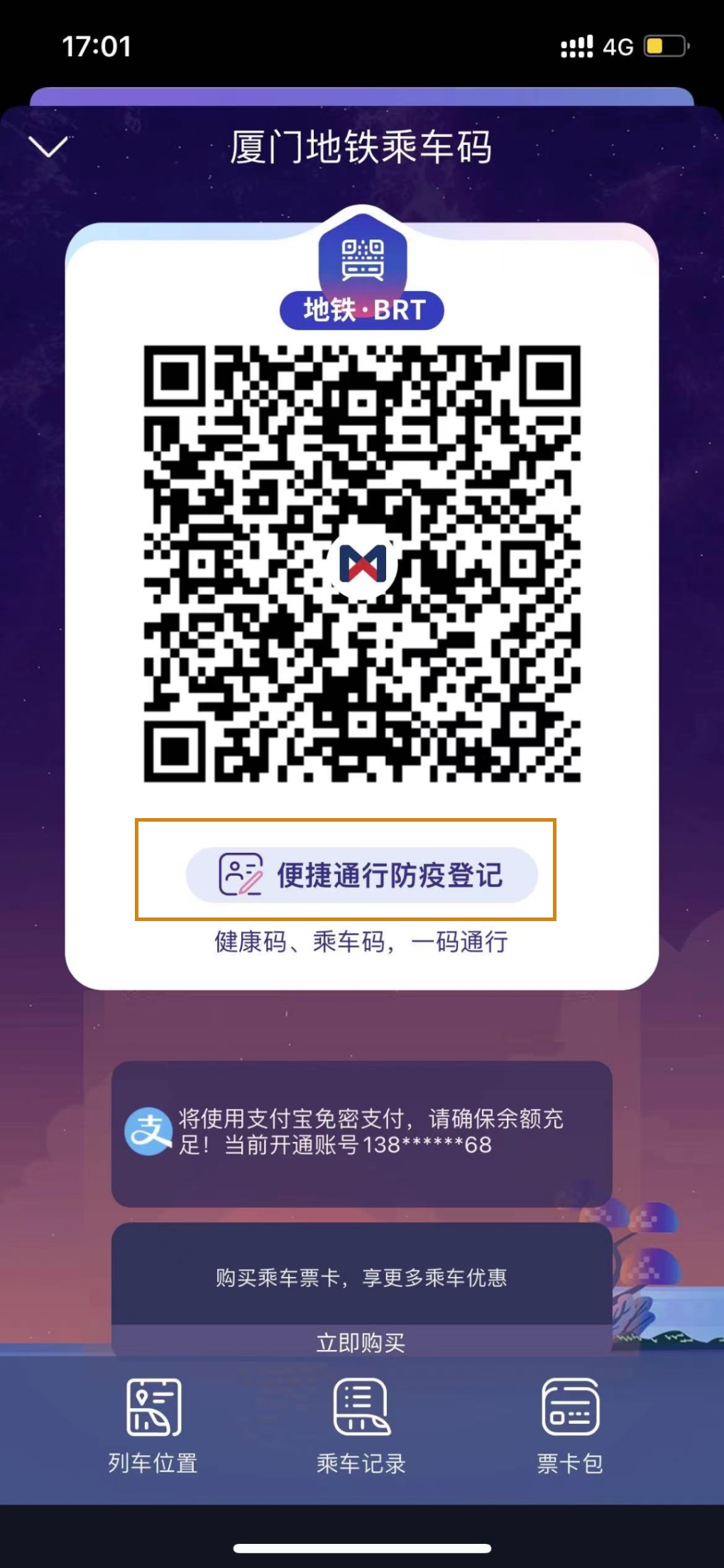 在乘车二维码下方点击“便捷通行防疫登记”