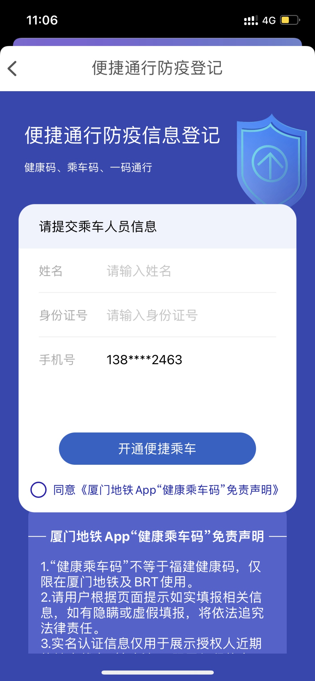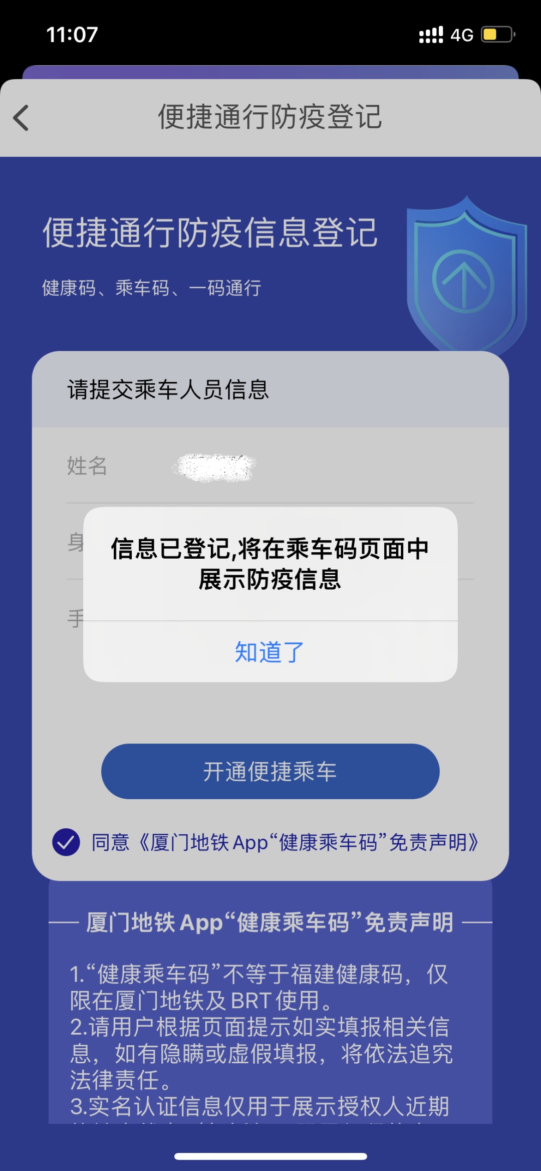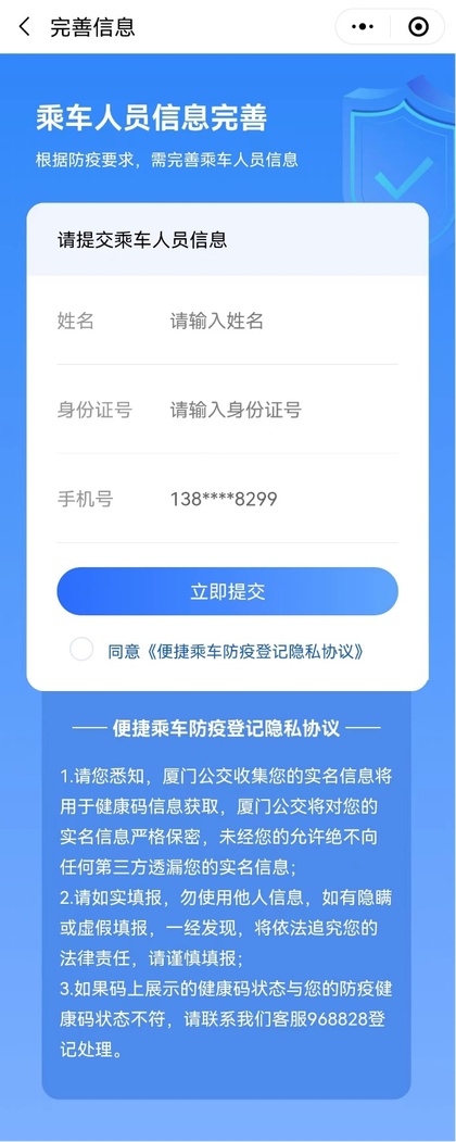 为节约您的时间,请提前完成厦门地铁APP实名认证并授权登记。厦门地铁向您承诺:您的个人信息仅用于疫情防控用途,厦门地铁将严格保障您的个人隐私。