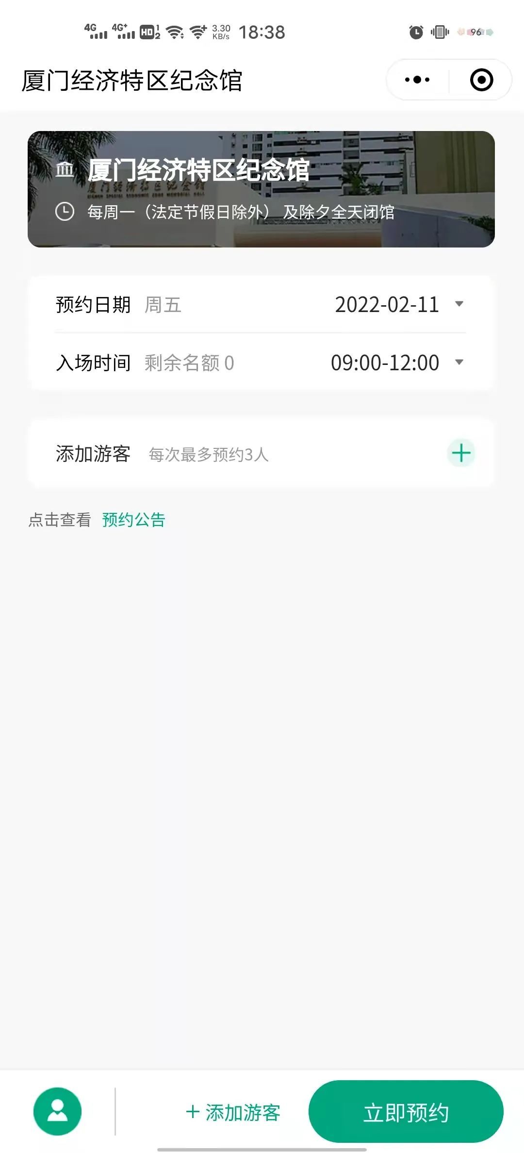 2、进入预约系统后分别选择预约日期、到馆时间及填写游客信息,确认上述信息后点击立即预约。